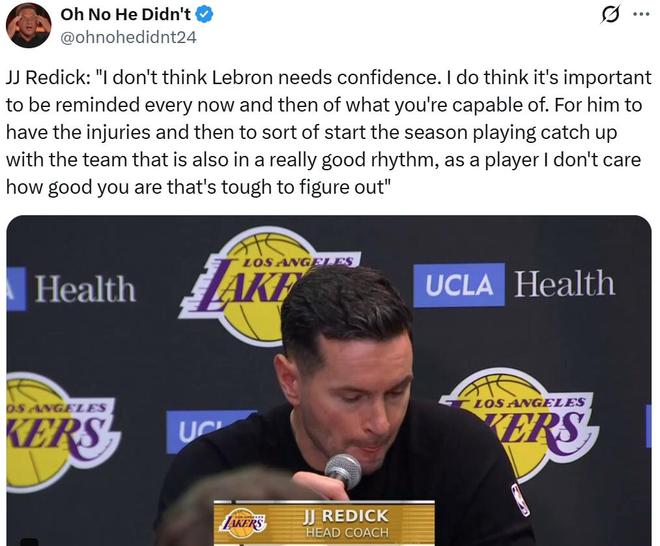 面对詹姆斯的表现,赛后主帅雷迪克公开表示:“勒布朗今晚就像是我们的串联纽带,那些战术处理真的太关键了,对于勒布朗来说,他永远不需要重拾自信,只是需要是不是体型自身具备何种能力而已。”